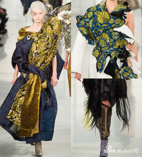 时尚总是疯狂,特别是Galliano掌管的Margiela,褶皱、拼接、闪烁的机理、透视的面料,将观者似乎引向一条癫狂道路。John Galliano用极致的材质为众人带来了一个纯手工艺的服装系列,既精彩又与品牌风格契合。