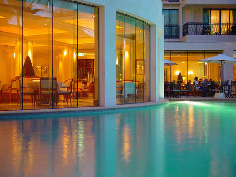 酒店大厅可谓金碧辉煌,巨大的梁柱耸立其中,与米、白两色的大理 石地砖交错、映衬,显得豪华又气派。除了大厅,Palazzo Versace的 每一间客房也均以金色为基调,而为了突出套房的别具特色,则以蓝 、红色系为主。且不说数百平方米的马赛克瓷砖由漂洋过海而来的意 大利工匠制作完成,颇为人称道的是,无论灯座、床罩、椅垫甚至于 浴室玻璃门,皆印有Versace的注册商标——古希腊神话中的蛇发女妖 Medusa肖像,全然秉承GianniVersace毕生所追求的美学品位。