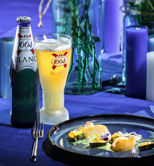前菜为“圣米歇尔山之夜”,采用法国进口蓝贻贝搭配1664,凭借得天独厚的产地优势,鲜美的法国蓝贻贝完美地带出1664啤酒的清爽甘甜。第二道菜为“极致法式风情演绎”。鹅肝素来有“世界三大美食”之称,这道菜将露杰鹅肝搭配1664啤酒,鹅肝的香味与啤酒的清新搭配在一起,让人回味无穷。主厨特别佐以蝶豆花调制的蓝色酱汁,在视觉上也让人眼前一亮。第三道主菜名为“舌尖上的交响曲”,主厨巧妙地在安格斯牛里脊中加入1664啤酒,将牛肉的鲜嫩和1664的果香创意结合,升华丰富你的味蕾。