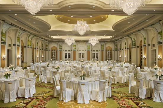 无柱式豪华宴会厅面积达1,200多平方米,层高九米,可容纳最多84台圆桌式晚宴,或举行1,500人站立式鸡尾酒会,更可分成3个小型宴会厅。其装潢色调柔和,光洁如玉,仿佛象牙雕刻的世界,完美融合现代时尚和精致优雅。宴会厅还配备最先进的专业设施,灯光调节系统、电动升降屏幕、80平方米LED显示屏,为婚礼进行提供全方位的技术支持。