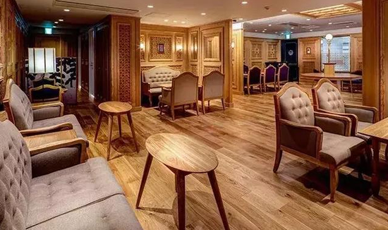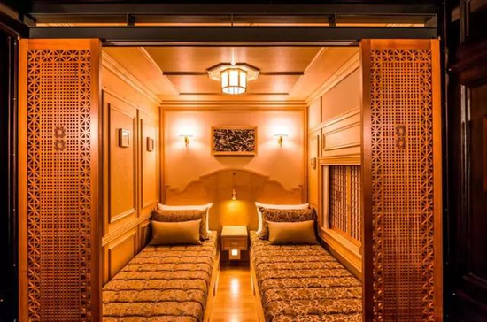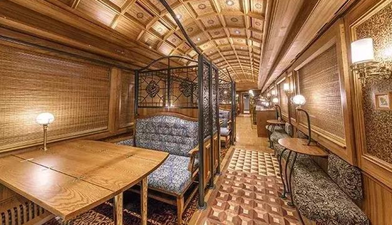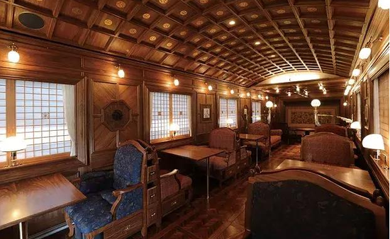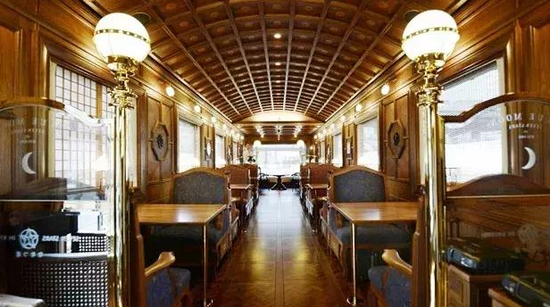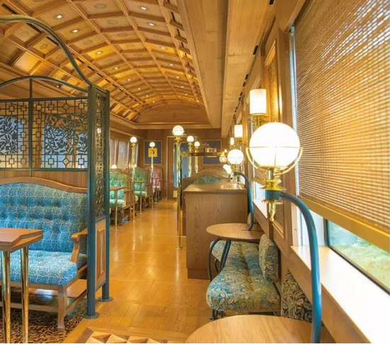火车总共7节车厢,内部的设计风格完美融合了西方和日本文化精髓,一踏进其中就会被温暖的木制与织物经典设计所包围,有一种置身好莱坞年代大片中的错觉。