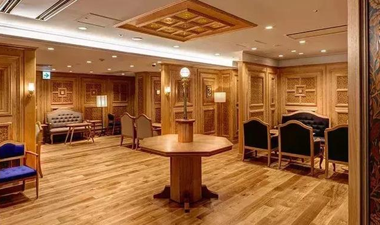 天花采用拱顶增加高级感,地板则用镶木手法拼出几何图形花纹。