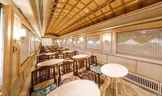 7号车是高端客室,设有半开放式的铁质雕花包厢,像移动中的一流酒店空间,既能保护私密,又有开放感。