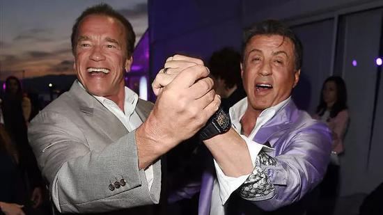 有意思的是,三人因戏结缘,在生活中也成为了非常要好的朋友。其中年纪相仿的史泰龙和施瓦辛格,更是从出道之出就相爱相杀——