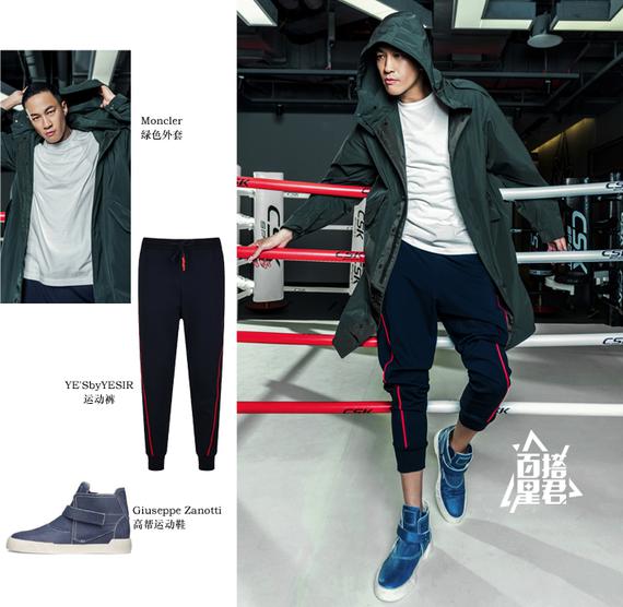 穿搭解析:外套:Moncler;运动裤:YE‘SbyYESIR;运动鞋:Giuseppe Zanotti。