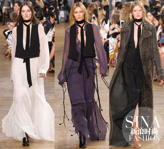 Chloé 硬朗与柔美元素的对撞随着女权主义的盛行,贴合女性心愿的随性而舒适的剪裁,成为了她们武装自己的方式。Celine不规则剪裁的披风、两侧和袖口完全没有缝合的衬衫,透气可能是小事,随心所欲才是真主题。另一个擅长以雪纺疼爱女性的品牌Chloe,在搭配了硬朗的马甲后,反而凸显了质感。