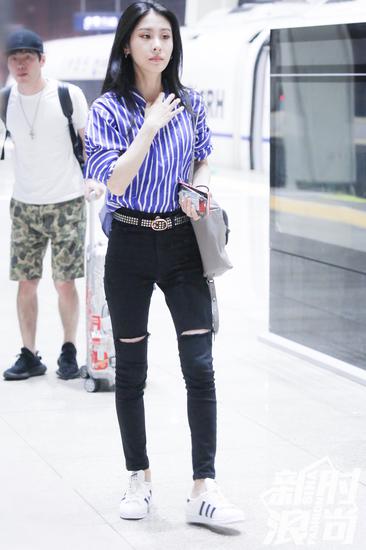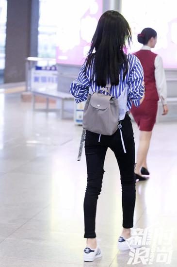导语:人气歌手张碧晨近日现身机场,身穿蓝白条纹衬衫搭配黑色修身裤、球鞋、小羊皮双肩包,轻便简约设计,打造随性优雅风范。