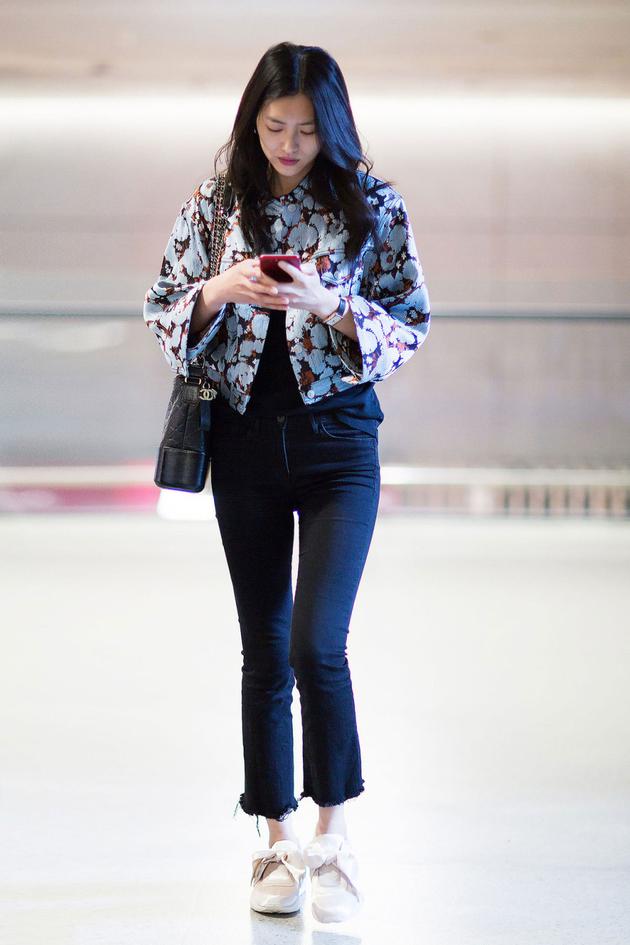 真让人羡慕嫉妒!行走的衣架子刘雯印花夹克搭配毛边牛仔裤,Chanel的新款包袋与Puma x Fenty丝带运动鞋,再配上表姐的甜笑,简直了。