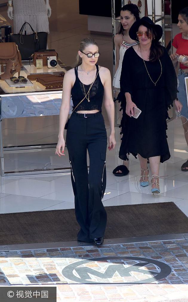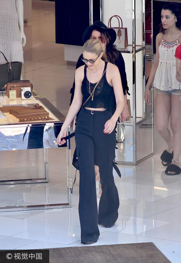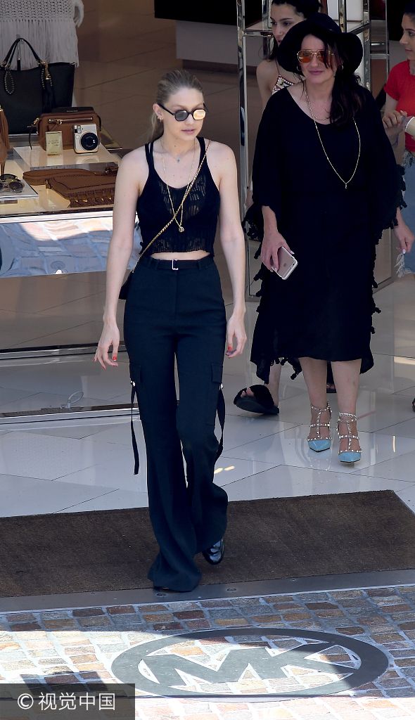 当地时间2017年7月11日,95后超模吉吉-哈迪德(Gigi Hadid)全黑LOOK逛商场。当天她笑容灿烂心情好,黑色吊带露精致锁骨,拖地裤显大长腿。