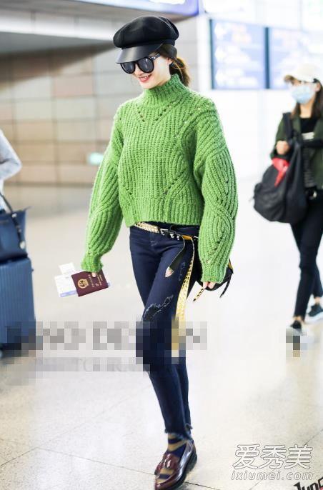 江疏影近日现身机场,身穿Isabel Marant绿色针织上衣