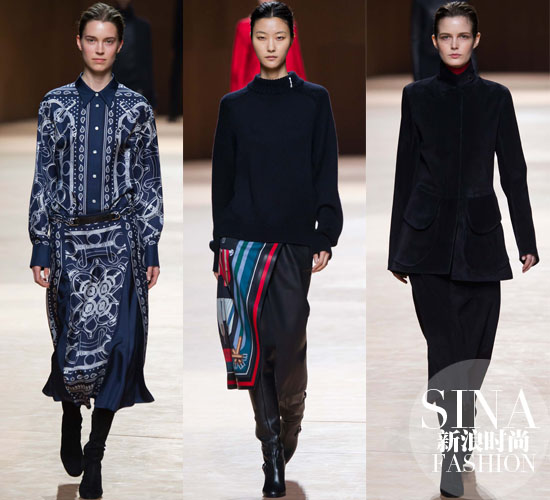 Hermès 印花从昨晚呈现的时装来看,Hermès高冷而不失优雅的女性形象并没有因为换了设计师而丧失,这与其他品牌换帅后另起炉灶的风格并未相同。严谨和禁得住考究的皮衣,明暗相间的半圆形图案以及金属细节的扣带设计,低调中尽显奢华。简约而不简单的分体裤装,无论搭配亮色衬衫、还是立领收腰外衣、亦或是皮草夹克,游猎在林间的女子精致有型并且舒适随意。披风式外套和宛若围巾般招摇的裙摆,把品牌标志性元素移植到了成衣设计师中,是Nadège Vanhee-Cybulski带来的惊喜。