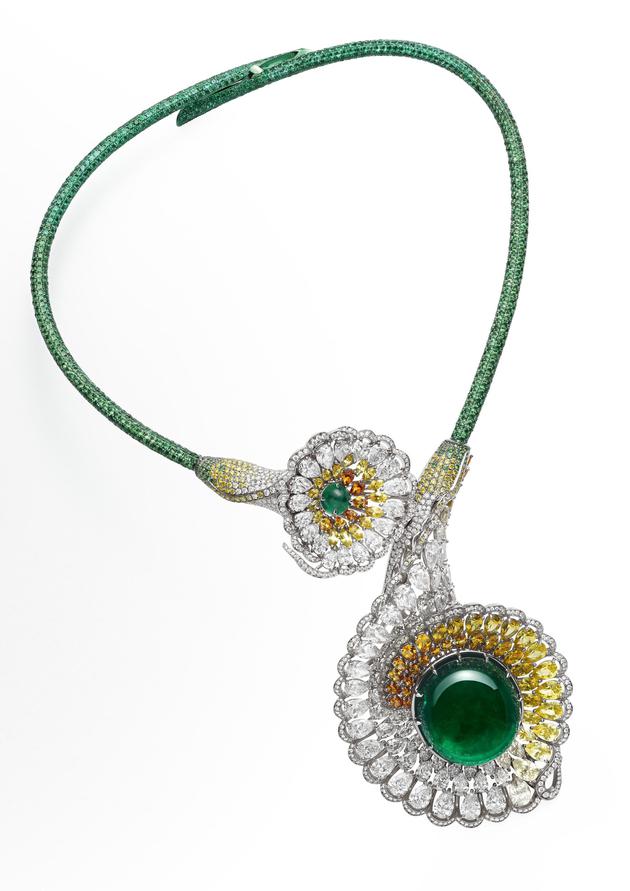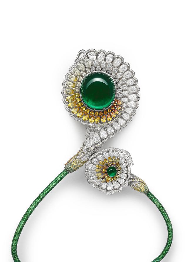 获奖理由:Chopard萧邦这件作品以“Love”与盛绽花卉为灵感,颂赞仁爱与自然。项链镶嵌一枚精心甄选的112.2克拉凸圆形祖母绿,耀目彩钻、蓝宝石及各色夺目半宝石簇拥于主石周围,共同映衬祖母绿的深邃光泽,与符合伦理道德标准的白金和谐交织,折射出璀璨光芒。