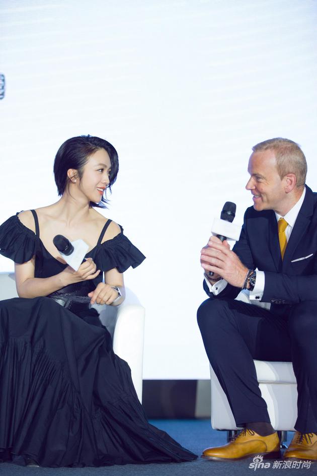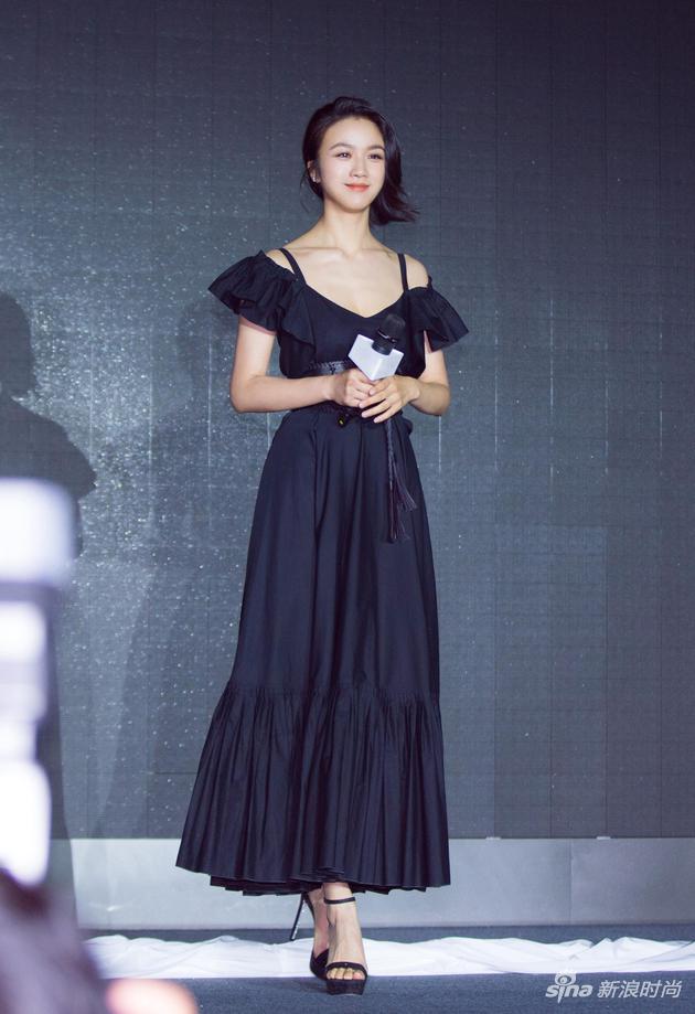 汤唯身穿的黑色长裙来自Alberta Ferretti 2017春夏系列,V领露肩设计,让汤唯小露香肩,女人味十足,搭配Rene Caovilla一字带高跟凉鞋,简约但不简单。