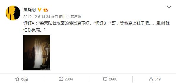 后来被说得多了,黄晓明也开始自我调侃了。脚骨折手术后,他发了一条微博:钢钉A:“整天贴着地面的感觉真不好。”钢钉B:“哥,等他穿上鞋子吧……到时就怕你畏高。”▼