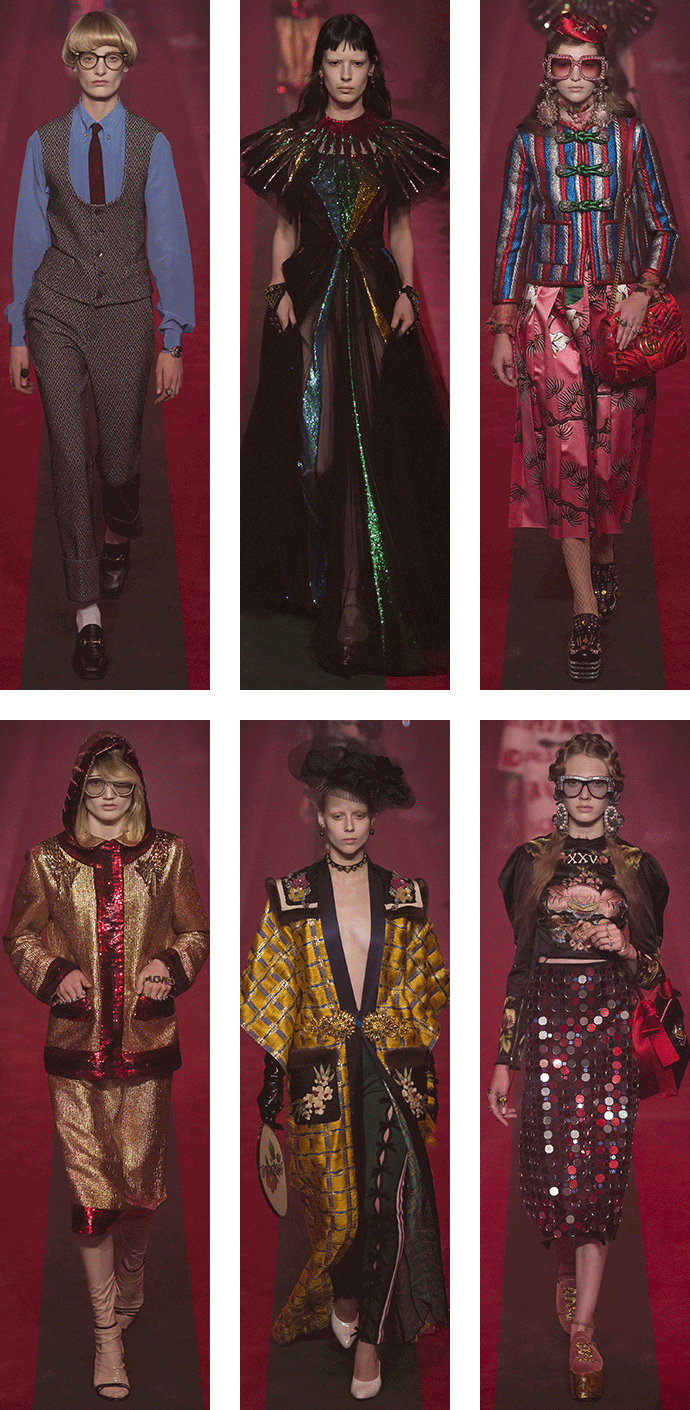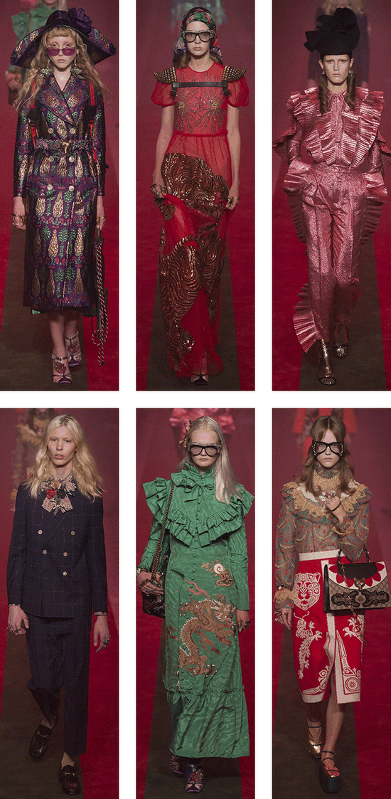 Gucci 2017春夏时装秀在一团亦幻亦真的迷雾中漂散而来,晶莹迷幻的秀场一片玫瑰色的粉红空间,不乏现代气息的亮片元素和反光的钻饰装裱气氛,缎面的秀台座位又把人拉回夜晚如梦似幻的文字游戏中,迷恋异域风情的Alessandro Michele,这一季专注于中国宫廷服饰中汲取灵感,大胆运用中国元素,将中式礼服的轮廓、团扇、花盆底高跟鞋、大面积中式花卉刺绣纷纷呈现,华丽的中国风美得让人睁不开眼。
