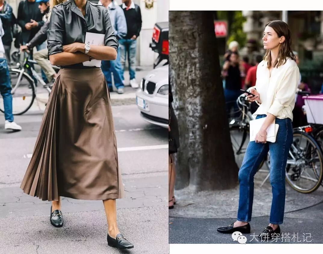 作为一双有些“懒”(一脚蹬的属性)的皮鞋,loafers还带着些许绅士与学院的严肃、拘谨,所以各种风格的女生都值得尝试看看。