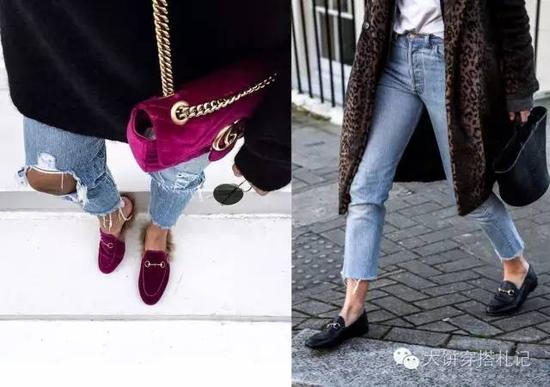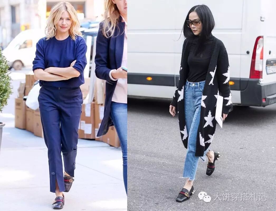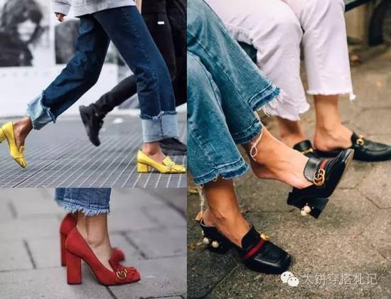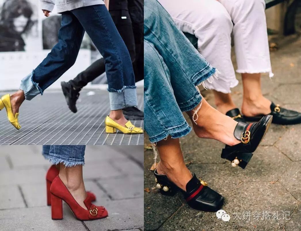 这种方形粗中跟不仅能站得稳,风格上还透着一股复古与时髦。并且可以与任何鞋款做结合,比如被穿的红到全宇宙的这两款Gucci乐福鞋就是最佳代表。
