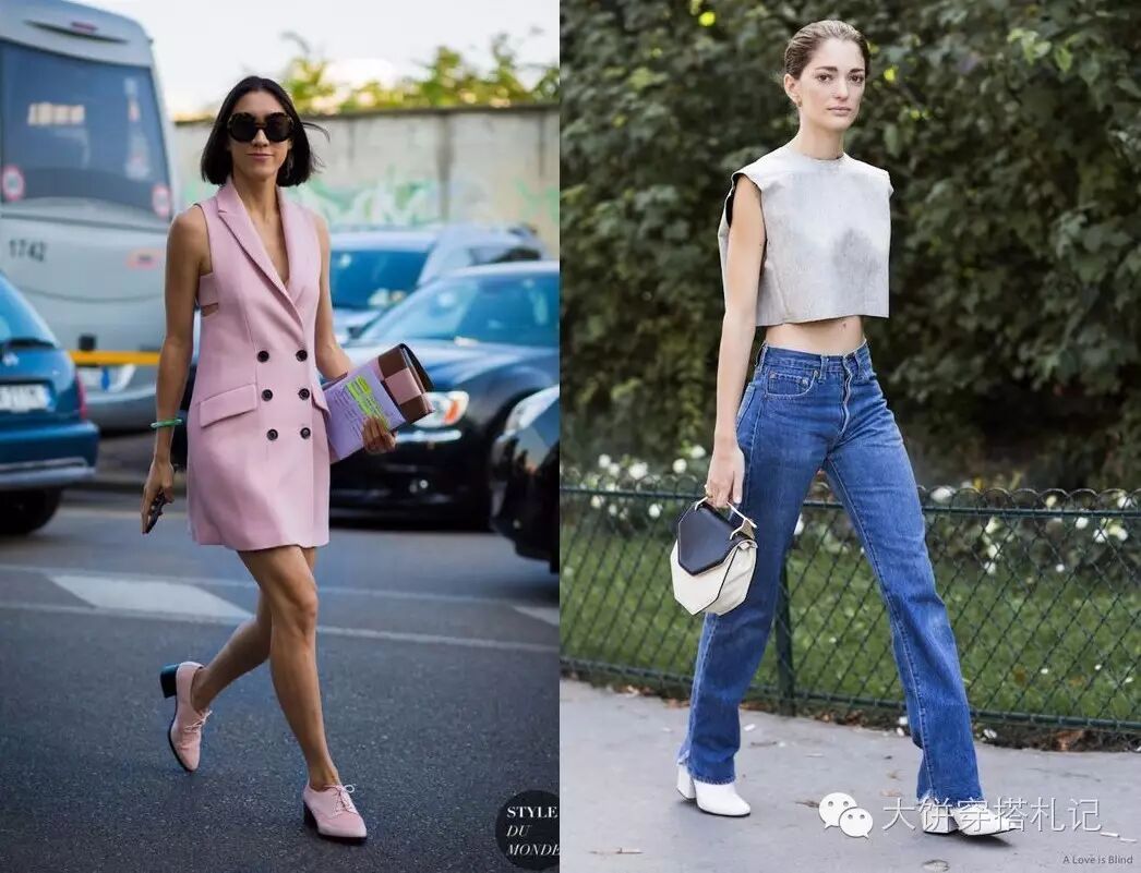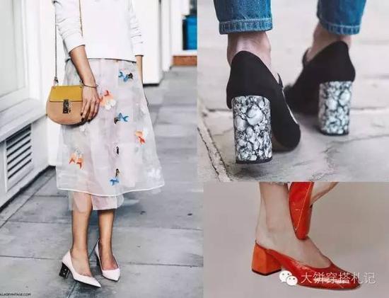 除了以上这些基础的选择,其实今年的大热门明明就是粗中跟鞋呀:既不像绝对霸权的尖头鞋般犀利也不像厚底鞋般笨重,同时又比平底鞋更能增加自信,这或许就是粗中跟火起来的原因。