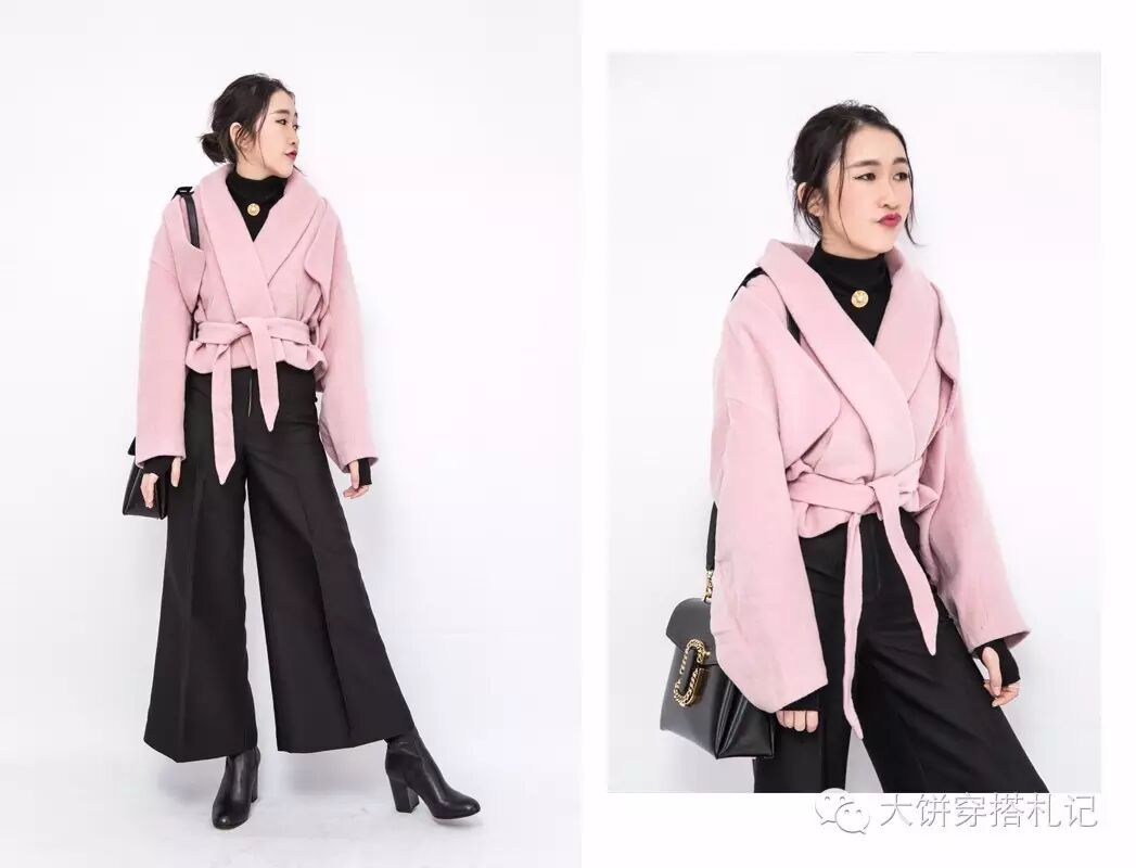 除了运用硬朗的元素,其实从色彩上看,有对比的黑色就能让粉色立体起来,所以万能的一身黑来搭配粉色呢子外套在冬日里尤为实用。这类颜色,还比如黑灰、藏蓝……等等。
