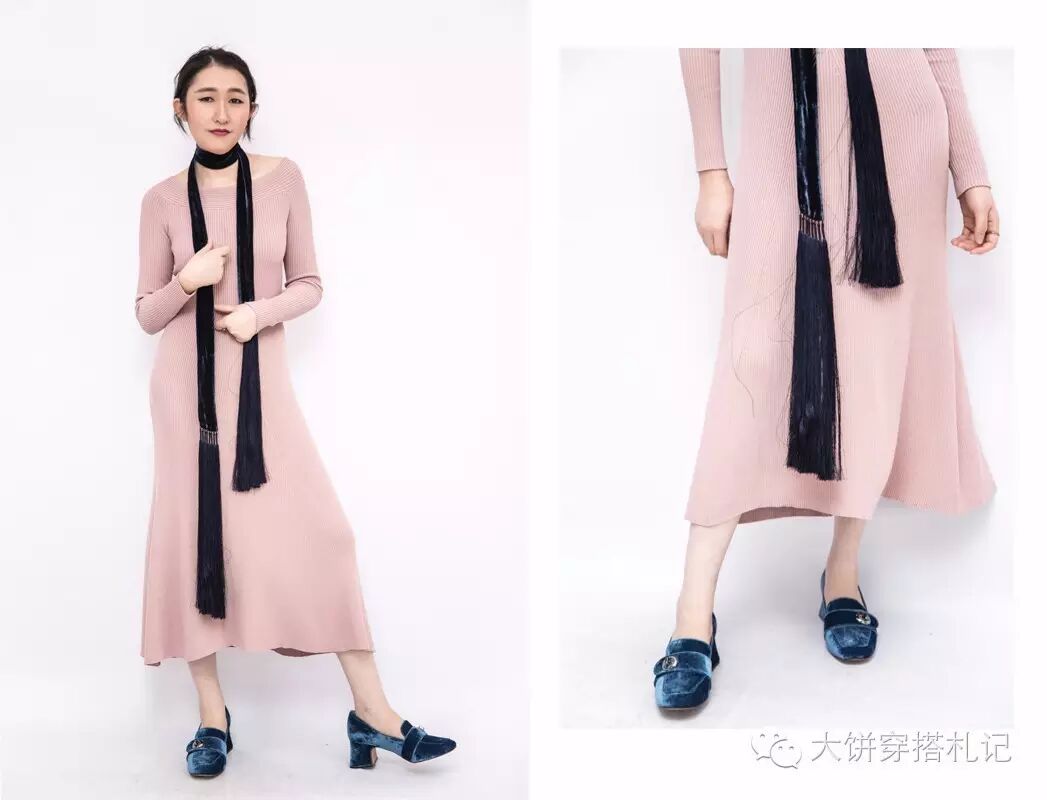 相比用基础的裸色鞋、白色单品……来搭配粉色裙装,加入一些光泽感的潮流元素也能化解粉色的“普通、平凡”既视感。这里饼用的就是时下大热的带有光泽的丝绒,以及动感的流苏~