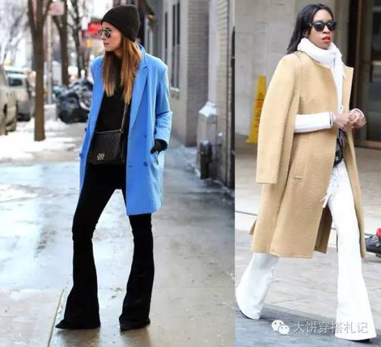 此外,盖住鞋面的超长裤腿裤也不是人人皆可滴~对于驾驭不了超长喇叭裤的姑娘,选择7~9分的短款小喇叭,搭配裹紧脚踝的袜靴也是冬日里的保暖必会。