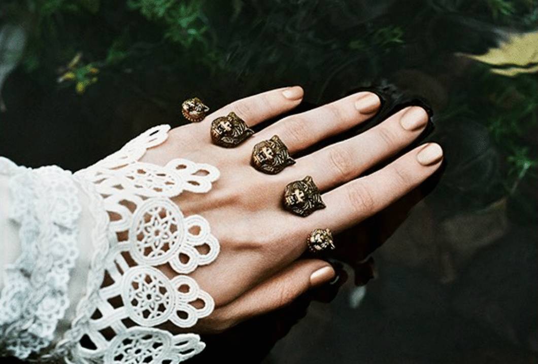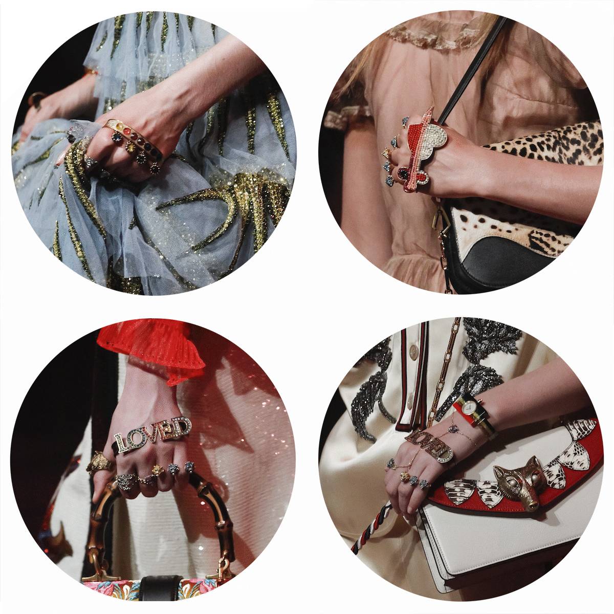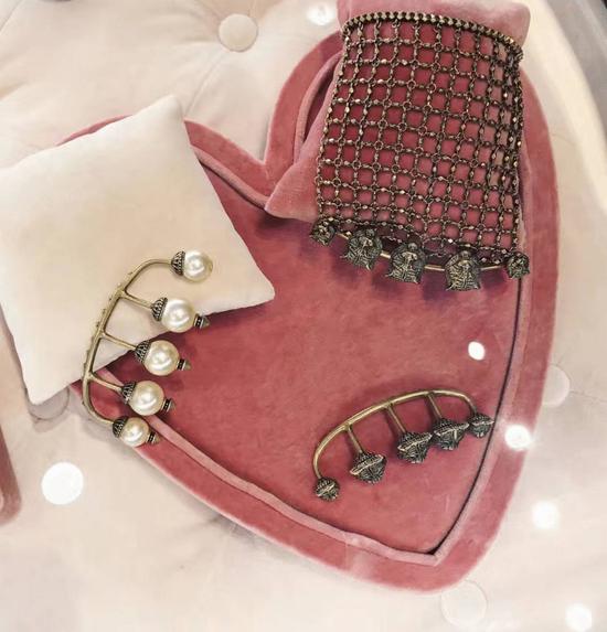 这种装饰手背而非手腕的饰品曾在前两年短暂的出现过,今年Gucci又把它带回了大家的视线中。 看着这些充满朋克风的Palm Cuff搭配仙气飘飘的长裙,让人不禁幻想自己就是这样集摇滚帅气与甜美可人于一身的girl!