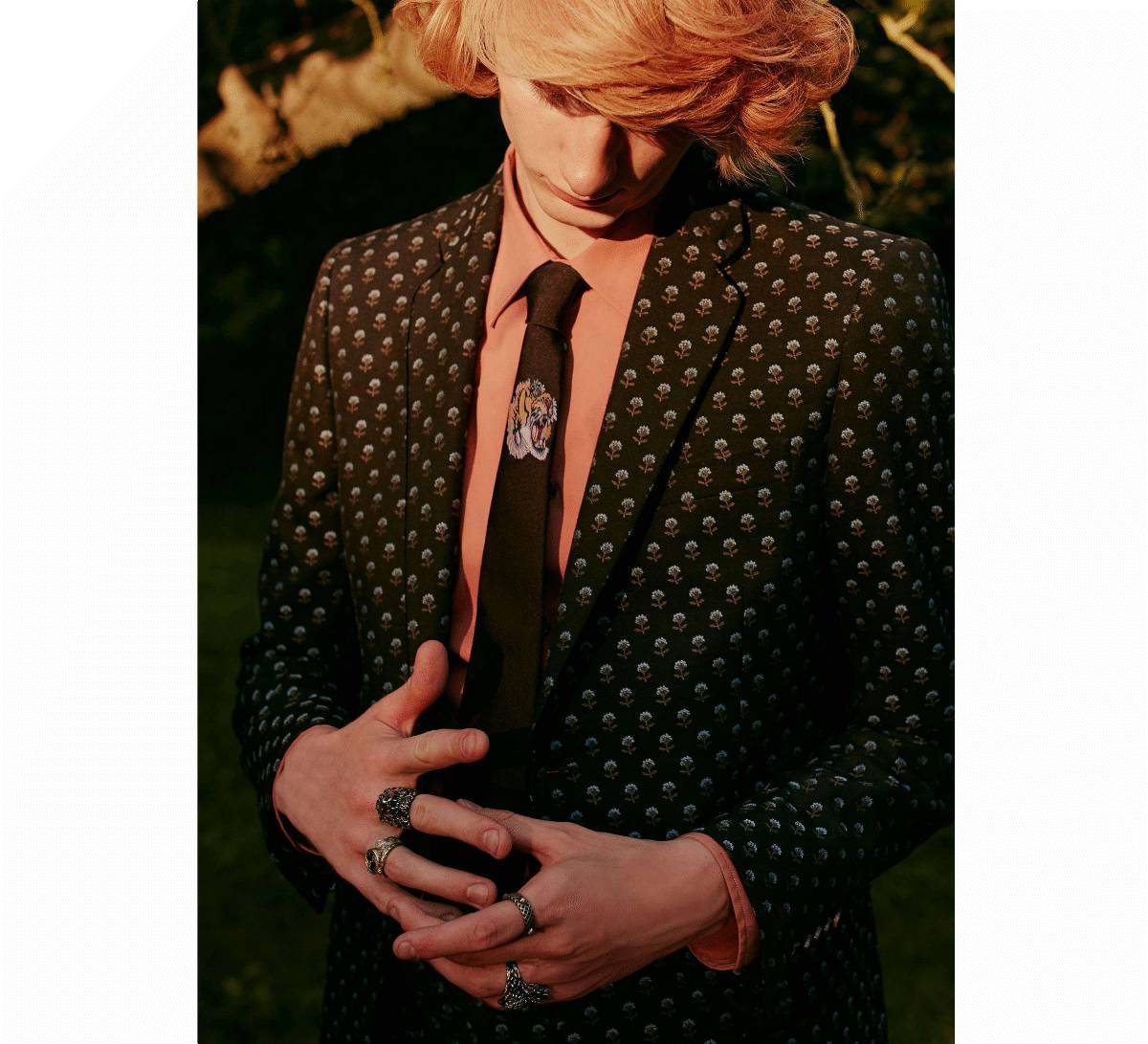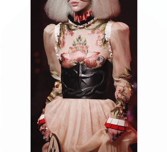 超宽皮质腰封让模特有一种未来女战士的即视感,这样强势的女性形象,也符合米开理模糊性别的设计风格。他认为符合Gucci审美的女郎不应该是专注于如何诱惑男性,因此中性设计在他的作品中出现频率相当高。