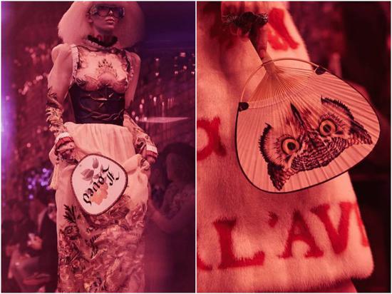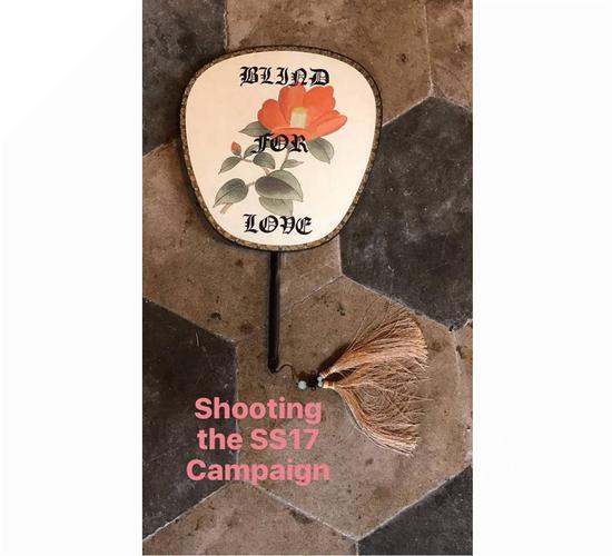 2017春夏大秀一开场,不少人就被这把充满中国风情的绢扇吸引住了目光。扇面上的花朵图案与哥特式字体组合发生了微妙的“化学反应”,神秘又优雅。