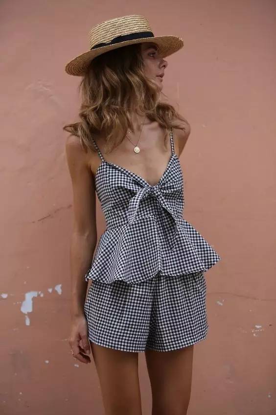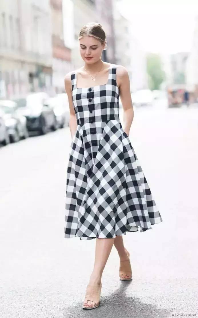 和衬衫的选择有所不同,我个人觉得,维希格纹连衣裙设计越简洁越容易穿好看。像这种简单的吊带短款,清爽又有活力,就很适合夏天。▼