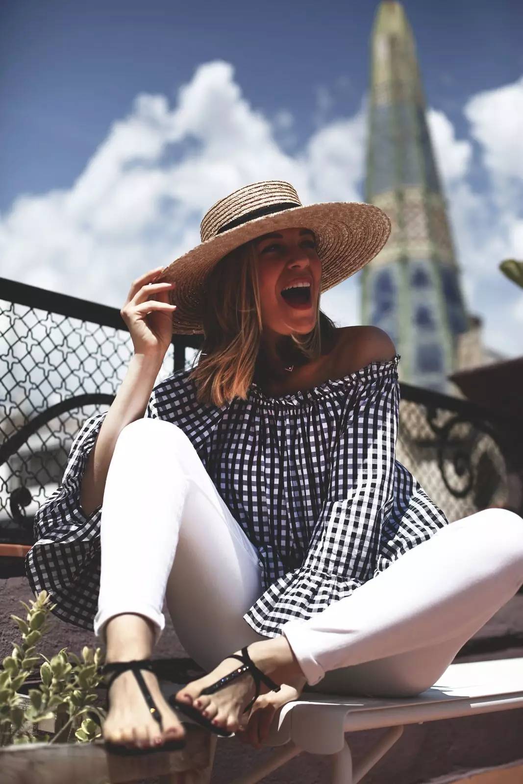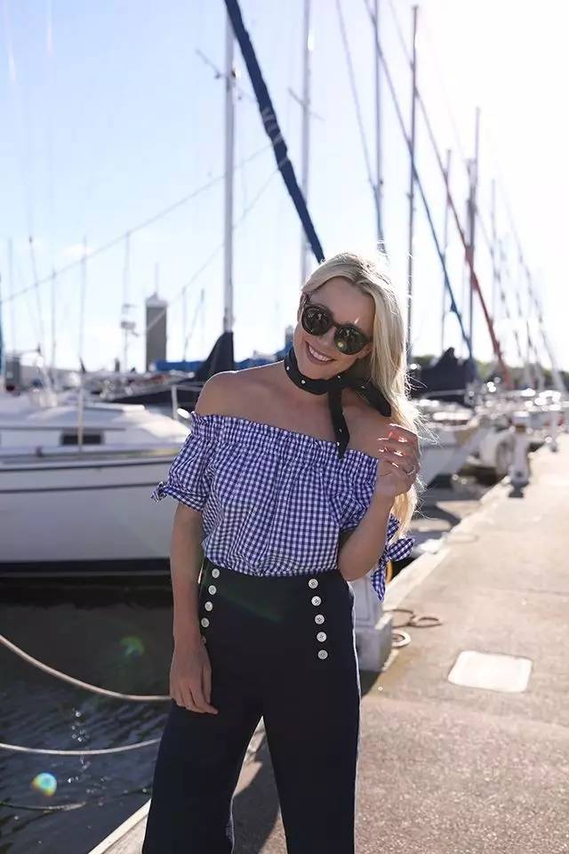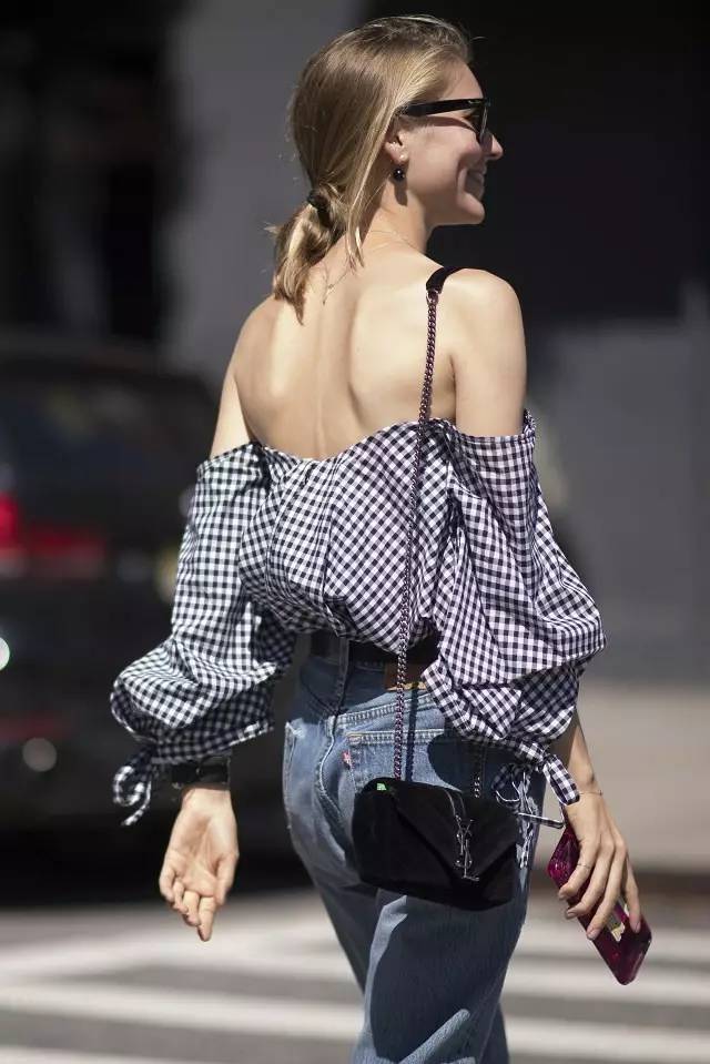 维希格纹配上今年流行的一字肩设计,露出性感的锁骨,慵懒又随意,视觉上也更清爽。▼