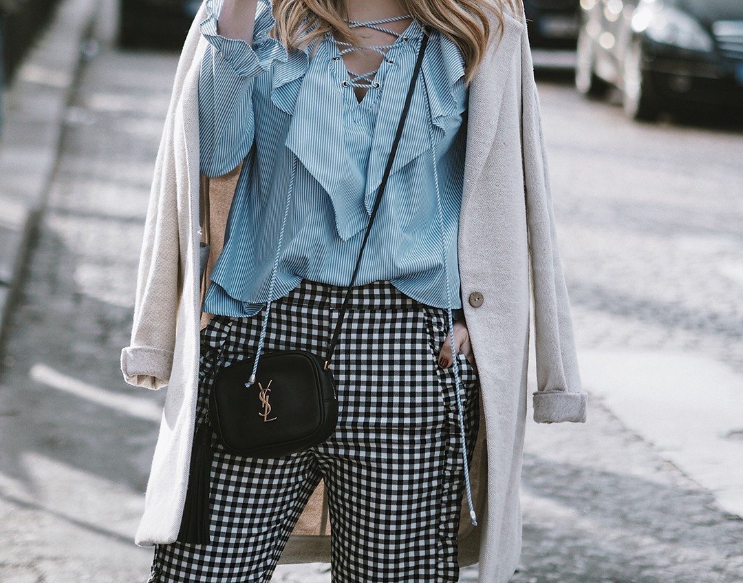 维希格纹下装想要穿得更时髦的话,可以大胆试试搭配条纹上衣,有趣又不杂乱。▼