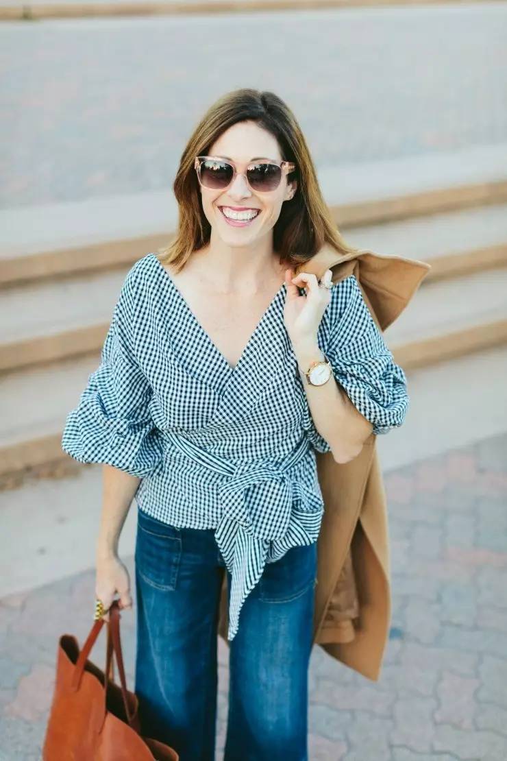 这种大V领、裹身设计的格纹衬衫,在衣服的下摆处再系上一个蝴蝶结,不仅勾勒腰身,满满的都是少女心。▼