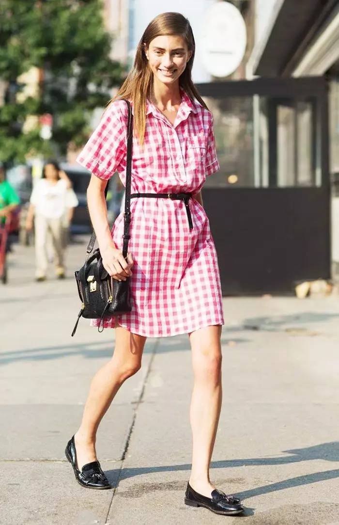 衬衫式的维希格纹连衣裙很适合通勤上班。▼