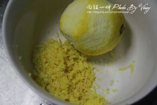 1、先来处理柠檬。将外皮洗净后,用刮蓉器刮出柠檬屑备用。