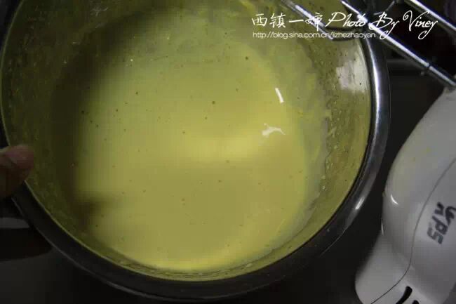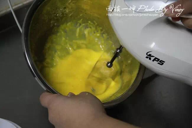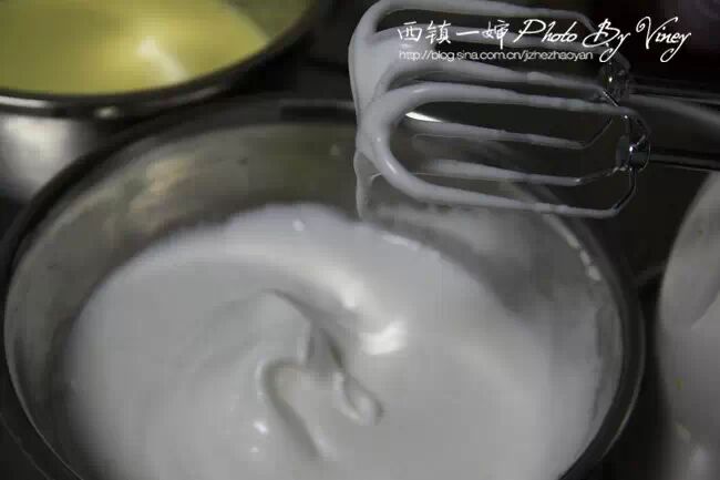 6、湿性发泡就是提起打蛋器时,蛋白有弹性的挺立,但尾端稍弯曲的样子。