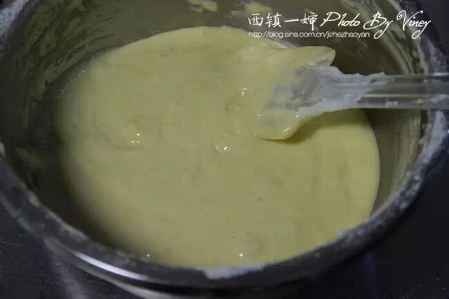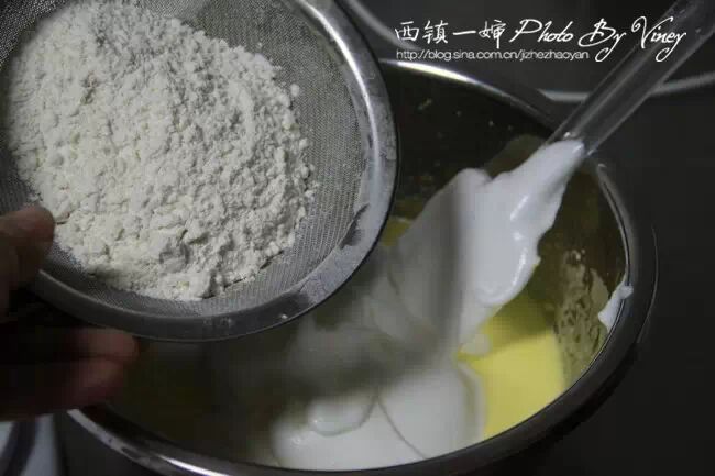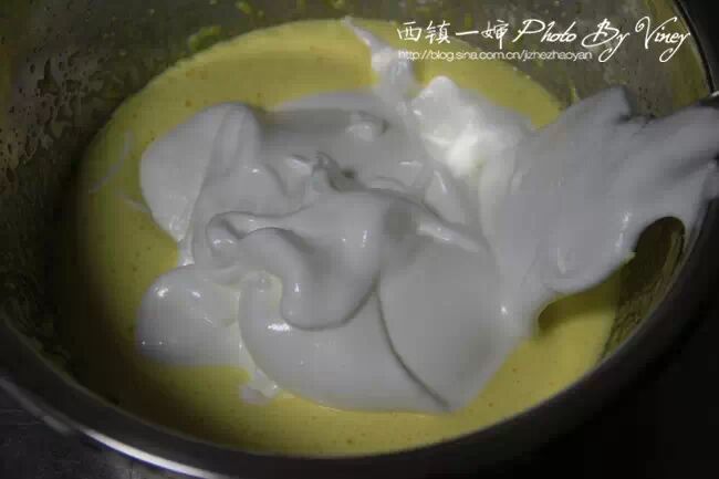 7、先拿出一半打好的蛋白,倒入刚才步骤4打好的蛋黄糊中