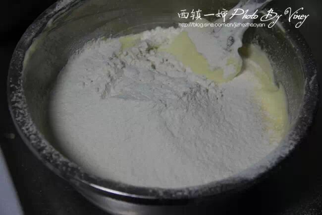 8、之后将低粉、盐和泡打粉混合过筛,先筛一半到上一步的蛋黄糊中,稍微搅拌均匀。