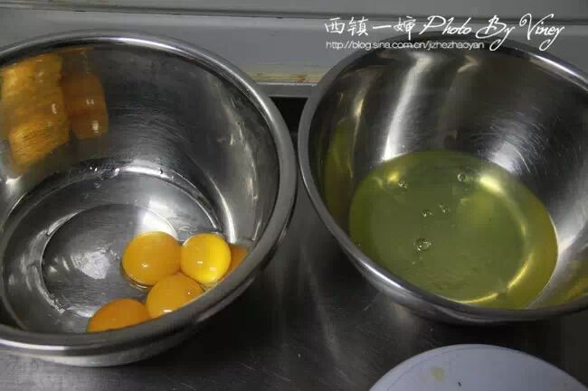 5、然后刚才分离的蛋白中,分三次加入细砂糖,打至湿性发泡的状态。