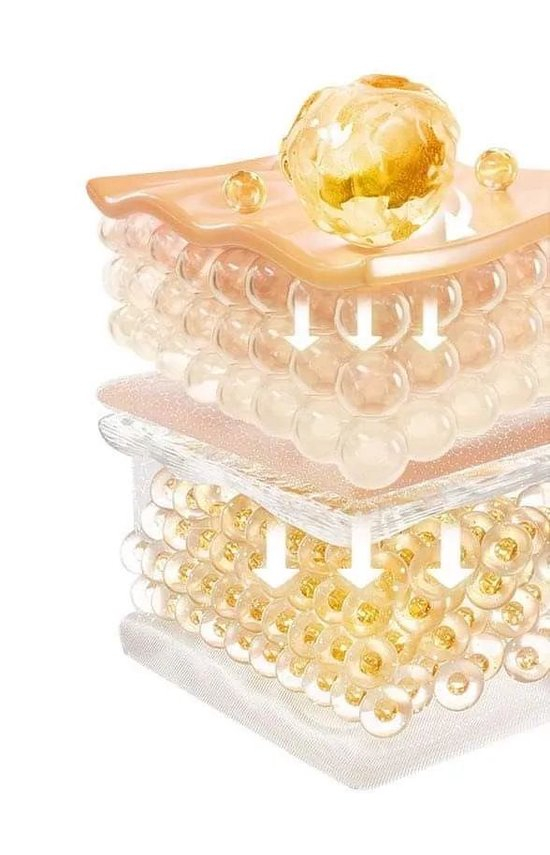 神奇活性精粹复配胶原双肽(棕榈酰六肽-12、棕榈酰六肽-14),内层促进胶原蛋白、弹力纤维新生,全面提升皮肤弹力网的支撑力;再搭配V-MICRO 微雕粒子(透明质酸+多种发酵提取物+藻提取物),外层提升皮肤饱满丰盈的质感。