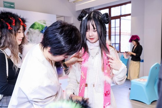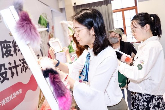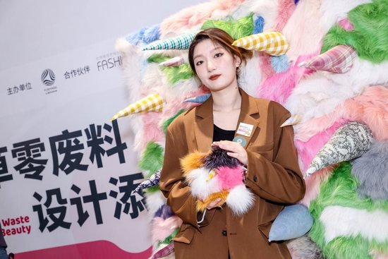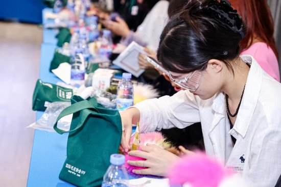 进入发布会的体验环节,首先是施乐的创作分享,她说:“在我得到天然皮草碎料的那一刻,脑海里灵感迸发,立刻想到它们可以被运用到日常生活中的角角落落。这些毛毛无论是质感还是颜色都非常优质,让我瞬时感觉拥有了无尽的可能。这两个月时间里,我在国际毛皮协会的帮助下学到了很多毛皮制作技艺和手法,也陆续着手将工厂快递来的零碎料转化为各种配饰,如帽子、围巾、手饰盒、镜子、项链、耳环、手环、戒指等等。通过将一些用旧了但又舍不得扔掉的物品与皮草碎料结合,让它们焕然一新。当我制作了许多服饰用品之后,发现自己从天然皮草感受到的能量带来的创意远不止这些。我开始思考都市人精神层面的缺失和需求。毛毛赋予了我一种特别的温暖和安全感,我想到用毛毛制作玩偶,让它们陪我走遍世界的每一个角落。与此同时,我还希望它们有着属于自己和人们之间的独特空间。因此,我创造了“豆仔”。豆仔既可爱又独特,既呆萌又耐造,直击人心。它不仅代表着希望和创造力,还将成为最贴心的伙伴,给人们带来快乐和温暖。无论你是谁,无论你身在何处,豆仔都愿意成为你的伙伴,为你带来快乐和温馨。今天,就邀请大家和我一起来完成一幅Mini豆仔艺术画。”