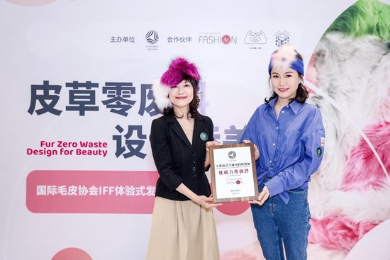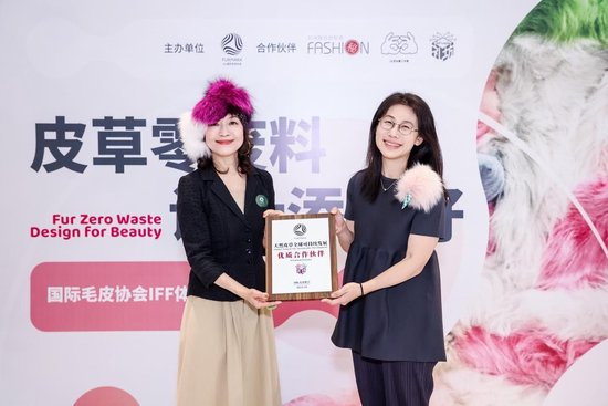 发布会上,国际毛皮协会中国CEO王晶为时尚背后的秘密®️创始人、当代艺术创作者施乐,礼坊颁发了“2023年度天然皮草全球可持续发展优质合作伙伴”奖牌,以此褒奖这些合作伙伴在促进天然皮草全球可持续发展的道路上做出的贡献和成绩。