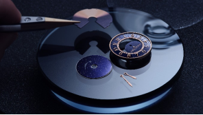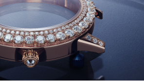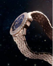 蓝色砂金石表盘宛如深邃夜空,以多层结构遮挡或显现流星;外表圈点缀爪镶钻石,进一步丰富视觉效果