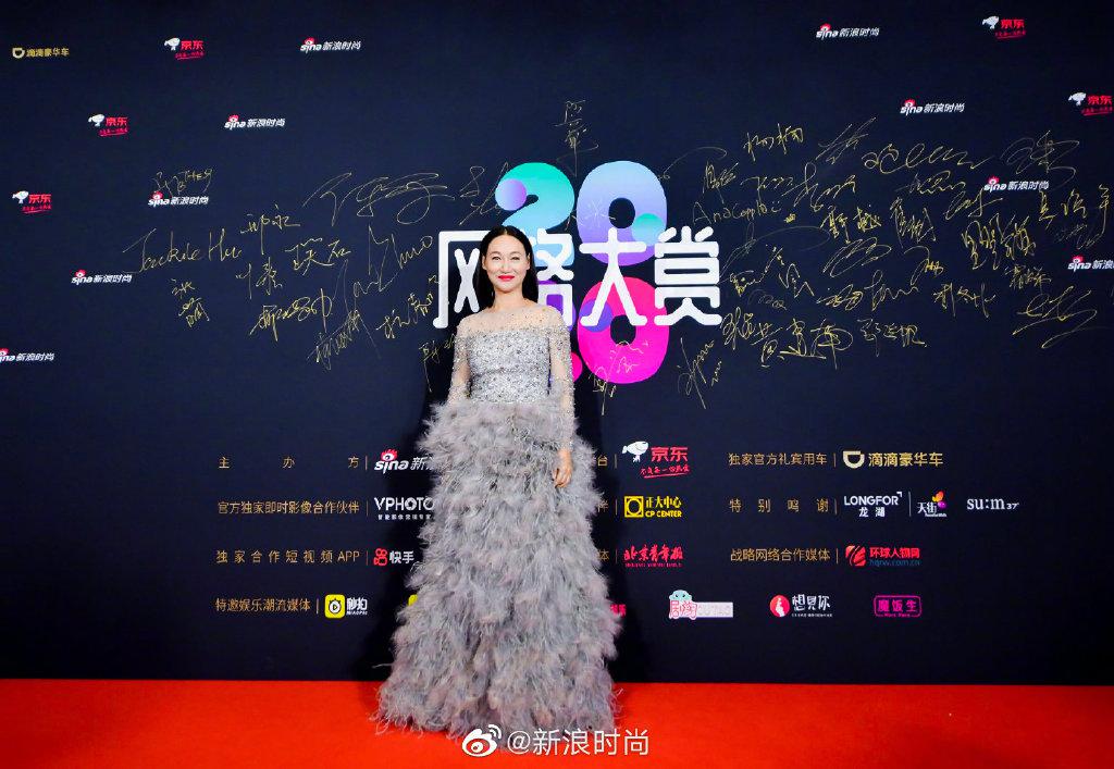惠英红一身羽毛长裙,精致优雅,温婉动人。