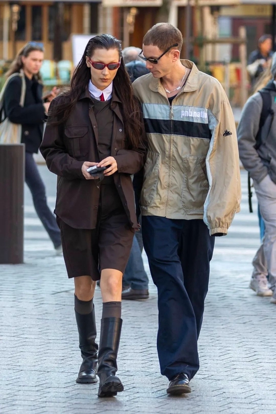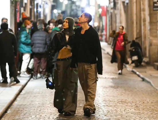 漫步巴黎街头,Bella 选择短款皮衣搭配宽松 Cargo Pants 露出迷人腰线;而 Marc 亦遵循女友穿搭思路,同样选择合身上衣。
