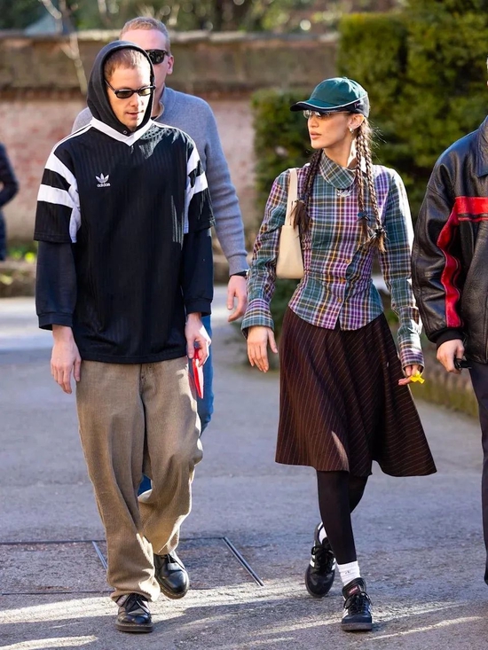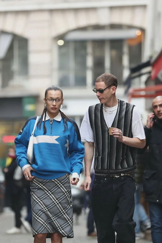 Balenciaga 秀场,两人纷纷拾起时尚感;Bella 以超大黑色开衫搭配破坏牛仔裤闪亮登场,在她身后的 Marc 也颇有默契地选择全套牛仔单品搭配连帽卫衣。