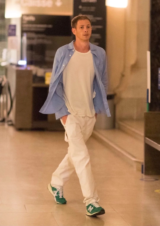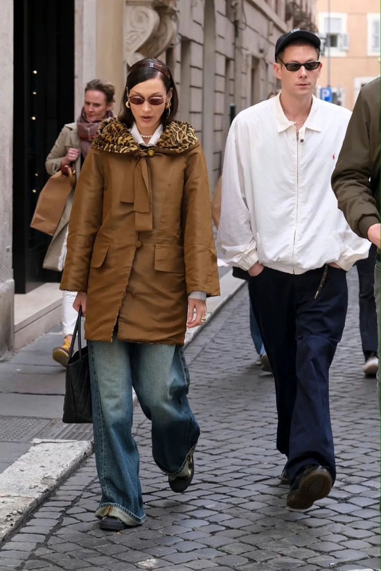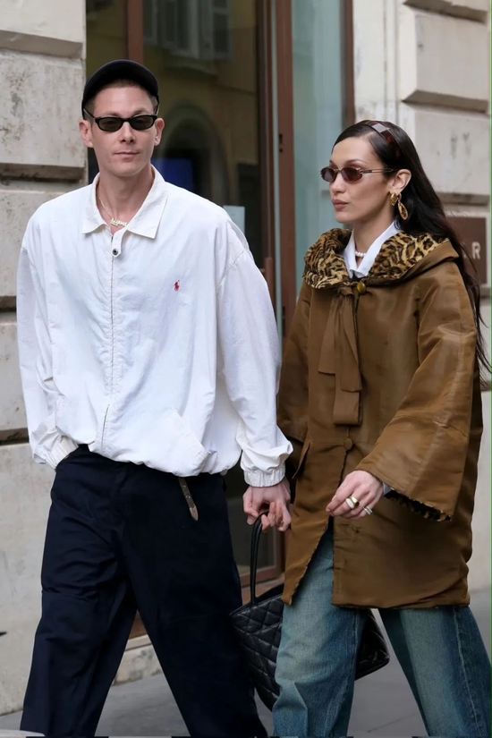 罗马街头漫步,Bella 选择豹纹内衬外套内搭白衬衫,宽松牛仔裤和运动鞋的选择令她时髦中不失舒适感;而男友亦选择白色 Ralph Lauren 外套相呼应,同样宽松的下装选择,与女友一起十分养眼。