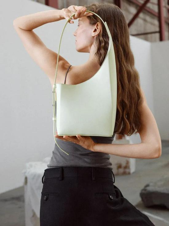 比如Aesther Ekme这只特别的不对称手袋,有个更特别的名字叫“半个月亮 (Demi Lune)”,水桶型的托特款式,内饰磁扣保护装在里面的物品,44(含手柄)×19.5×11.5的尺寸日常来说也蛮够装了。