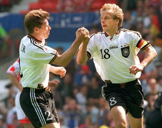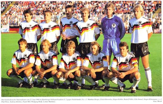 1988年欧洲杯,克林斯曼身穿的黑红黄三色的战袍堪称是德国队史上最经典的一款战袍。