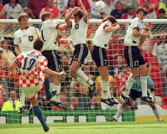 又不得不提到1996年的欧洲杯,克罗地亚队在世界足坛的处子秀。25个红白相间的方格组成的球衣也是经典之作,在绿茵场上格外引人注目。
