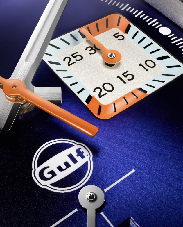 腕表表盘结合海湾石油的时尚风格与摩纳哥系列特色美学,三色设计首次被应用于3点钟位置的分钟计时小表盘上。与此同时,表盘上的海湾石油品牌标识以全白色呈现,这在摩纳哥系列海湾石油版腕表作品中也是首次。